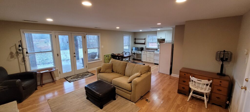 One bedroom one bath apartment with living room, fireplace, access to shared laundry, kitchenette with dining area, separate parking and porch. Utilities included. Overlooks pond and wooded areas, easy access to walking trails Greenway access and amenities nearby. Owl’s roost neighborhood